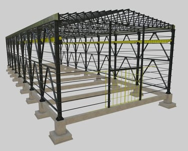 Fabricación y montaje de naves industriales de gran envergadura, optimizando espacios y asegurando resistencia estructural.